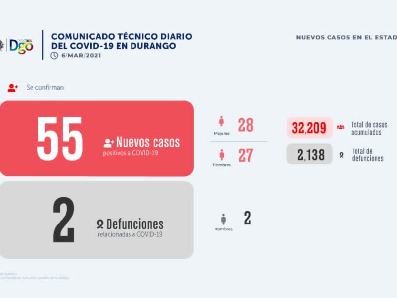 Este sábado se confirmaron 55 nuevos casos de Covid-19 para acumular 32 mil 209 contagiados, en tanto que se reportaron dos decesos para sumar 2 mil 138 defunciones, al tiempo que se vacunaron 4 mil 204 adultos mayores para sumar hasta 21 mil 136 personas de más de 60 años inmunizadas. Fernando Ríos, vocero de la Secretaría de Salud del Estado de Durango precisó que de las dos nuevas defunciones, ambos hombres, tenían su residencia…
